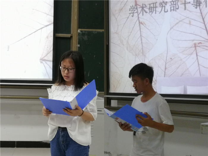 最后是学术研究部部长秦爱红对学术部工作做总结。首先她放出自己制作的关于学术部工作的视频,将学术这一年的工作都展示众人面前。随后她介绍到学术本学年的工作主要在活动策划和课题组方面,并强调学术部在本学年中“读书分享会”和“传统文化小讲堂”取得较为突出的成绩,本学年这两个活动干事参与率增高且干事们表现突出。特别是“传统文化小讲堂”的举办,为同学们提供了一个交流沟通的平台。随后,学术部干事代表何贵杰表示,在学术部他主要学习到如何写策划,以及如何更好地与人交流。“不忘初心,方得始终”,他的坚持换来了老师和同学们的鼓励和认可。