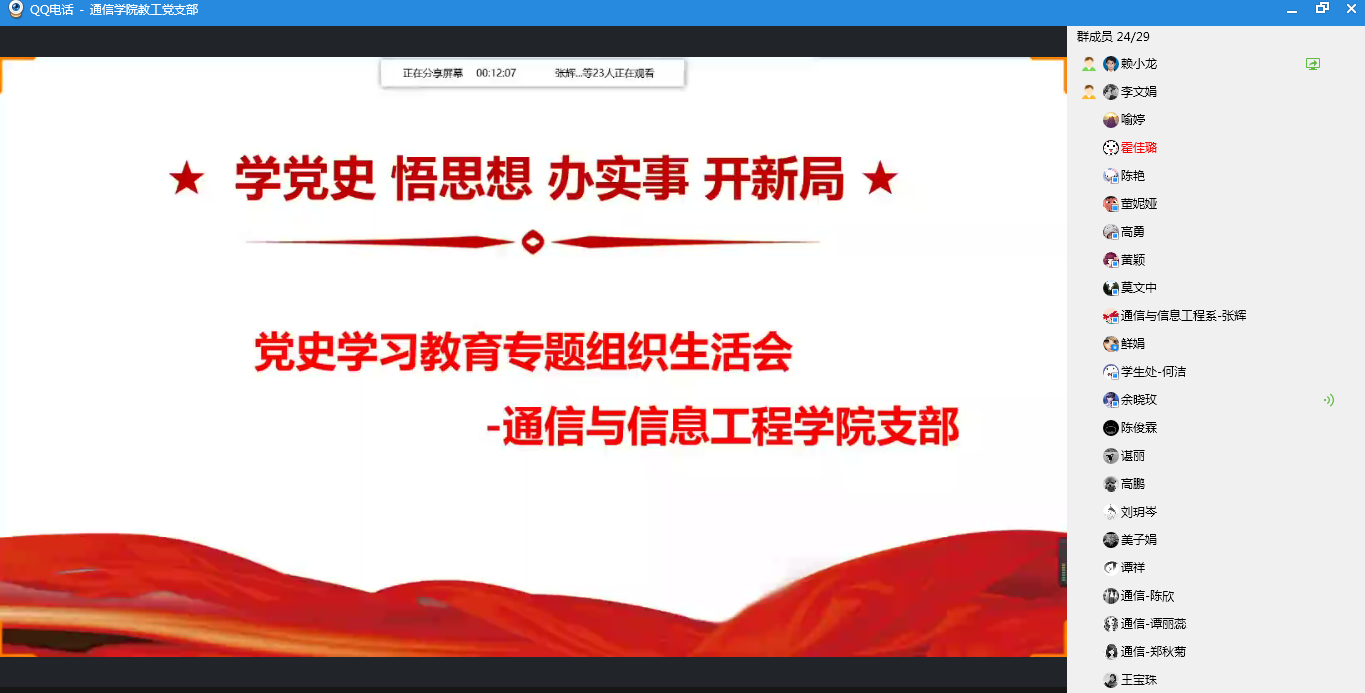 为进一步深入学习习近平新时代中国特色社会主义思想,深化“不忘初心,牢记使命”主题教育成果,提升党支部政治功能和组织力,教育引导党员增强“四个意识”、坚定“四个自信”、做到“两个维护”,确保党的路线方针政策和决策部署的贯彻落实。8月11日上午10:00,通信与信息工程学院党支部开展了以“学党史、悟思想、办实事、开新局”为主题的党史学习教育专题线上组织生活会,会议由支部书记赖小龙同志主持。