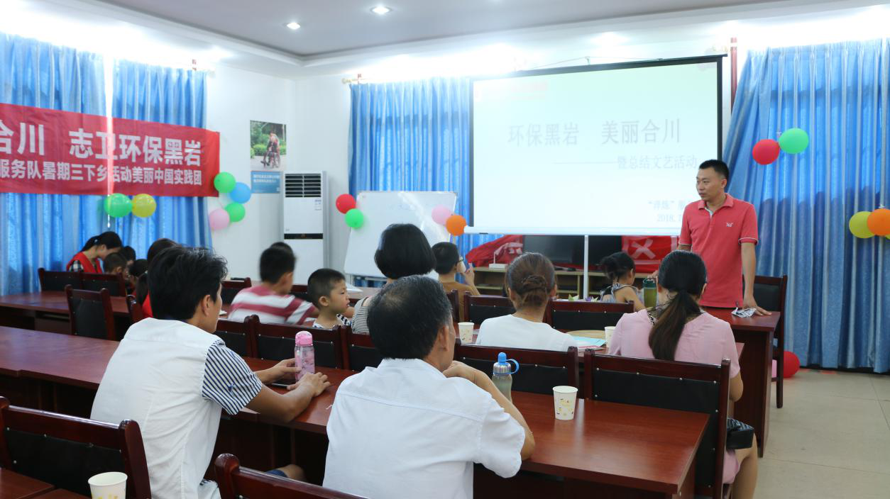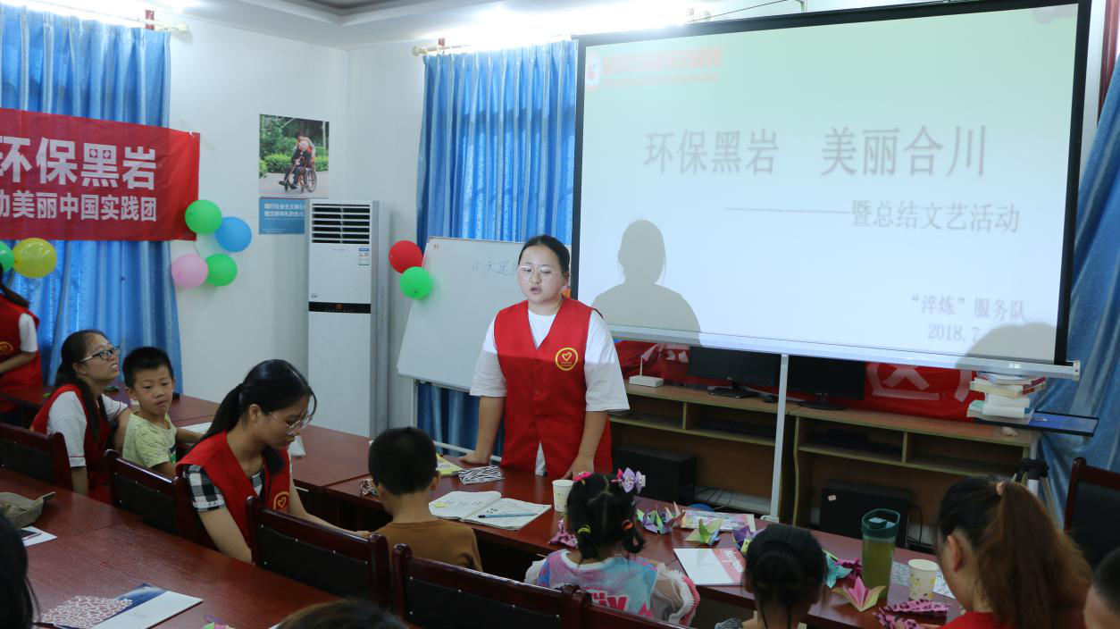 志愿者们在黑岩社区办公室展开了“环保黑岩,美丽合川-暨总结文艺活动”。首先是志愿者和小朋友一起带来的海草舞,活跃的气氛瞬间感染了在场的社区工作人员、家长、孩子、志愿者;接着志愿者弹唱了一首《后来》,祝愿孩子们有一个美好的未来,优美的歌声赢得了热烈的掌声;然后是志愿者带来的歌曲《小跳蛙》《葫芦娃》,欢快的音乐也让小朋友们跃跃欲试,想要一展歌喉……随之就是孩子们的“表演专场”,让孩子们尽情的展示自己,志愿者为孩子们颁发了奖状和奖品,鼓励孩子们在成长的道路上勇敢的表现自己。一个个有趣的节目让所有人沉静在快乐中,他们的脸上满是灿烂的笑容。“淬炼”服务队带着16颗志愿心来到黑岩社区开展环保工作,居民们的微笑便是对志愿者五天活动的认可,也是对他们最大的鼓励。