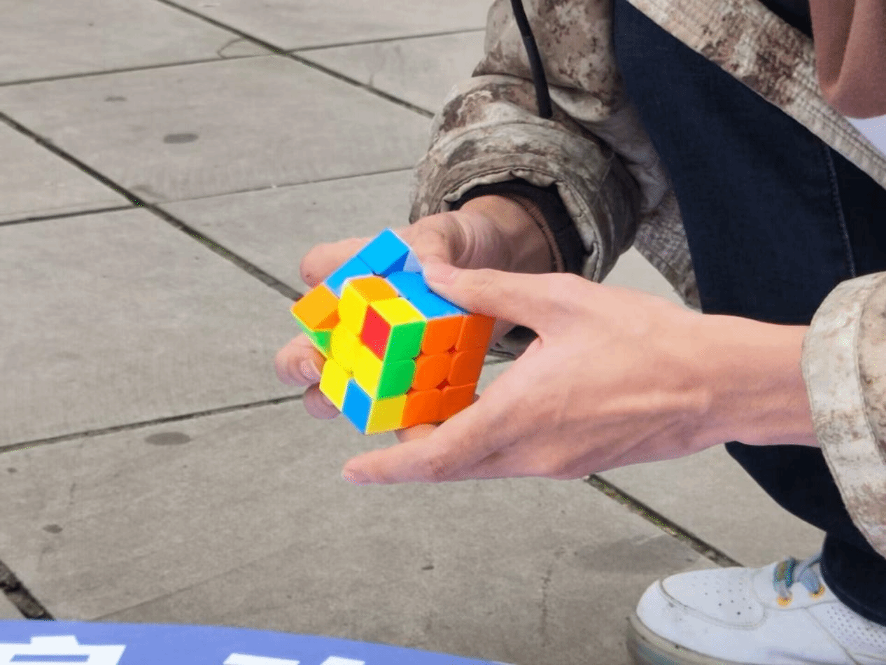 现场除了弥漫着紧张挑战的气息,也有温馨的一幕。魔方爱好者对魔方达人挑战的完成纷纷表示惊叹,魔方圈转变为“磁力圈”,大批魔方爱好者被吸引,开始加入到魔方的挑战中。并不擅长魔方的爱好者与魔方达人一起探讨魔方其中的奥妙,围圈分享魔方经验,从互不相识到熟络探讨,建立了神奇的友谊,以兴趣吸引到一群志同道合的朋友们。