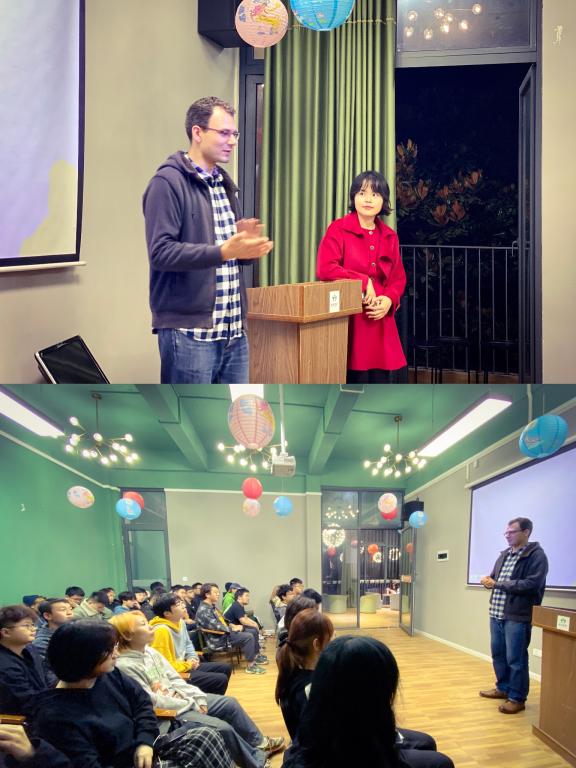 别过夏花绚烂,走进秋叶静美。为丰富中德应用技术学院与淬炼·国际商学院的国际化元素,进一步锻炼提升同学们的英语口语表达能力,中德应用技术学院双语教研室与淬炼·国际商学院国际商科教研室秉承“四位一体+双院制”的人才培养模式,于近期在花果书院多功能会议室联合开展了以“圣马丁节”为主题的第七期雅思之路沙龙活动。此次沙龙由中德学院雅思老师钟佳利老师与外教Elias联合主持,气氛活跃。