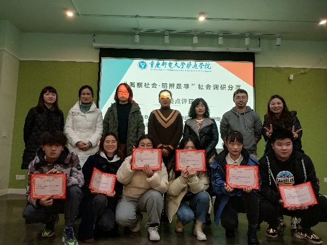 活动后期,依据各小组的社会调查报告和汇报人的现场陈述,评委进行打分,工作人员根据两项成绩的总分进行排名,并公布了获奖名次。王艺同学凭借自己熟练的演讲和扎实的基本功摘得桂冠,黄绘霖和黄嘉渝同学凭借自己对内容的把控和调查形式的多样化获得二等奖。黄浪、余成娟和王春生同学获得三等奖。评委老师为各位选手颁发了荣誉证书并和同学们合影留念。