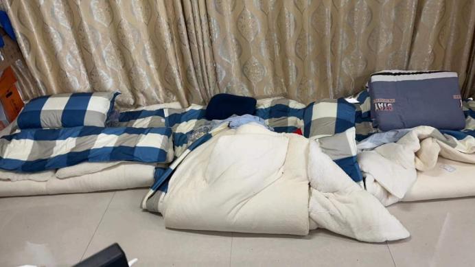 夜晚,办公桌、沙发椅、地板...办公室的一切家具均可成为他们的“床”。即使条件艰辛,但老师们任然充满了斗志,心系在寝室的同学们,保障他们的一日三餐、饮用水及生活必需品。