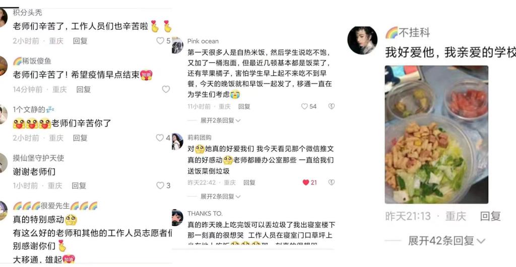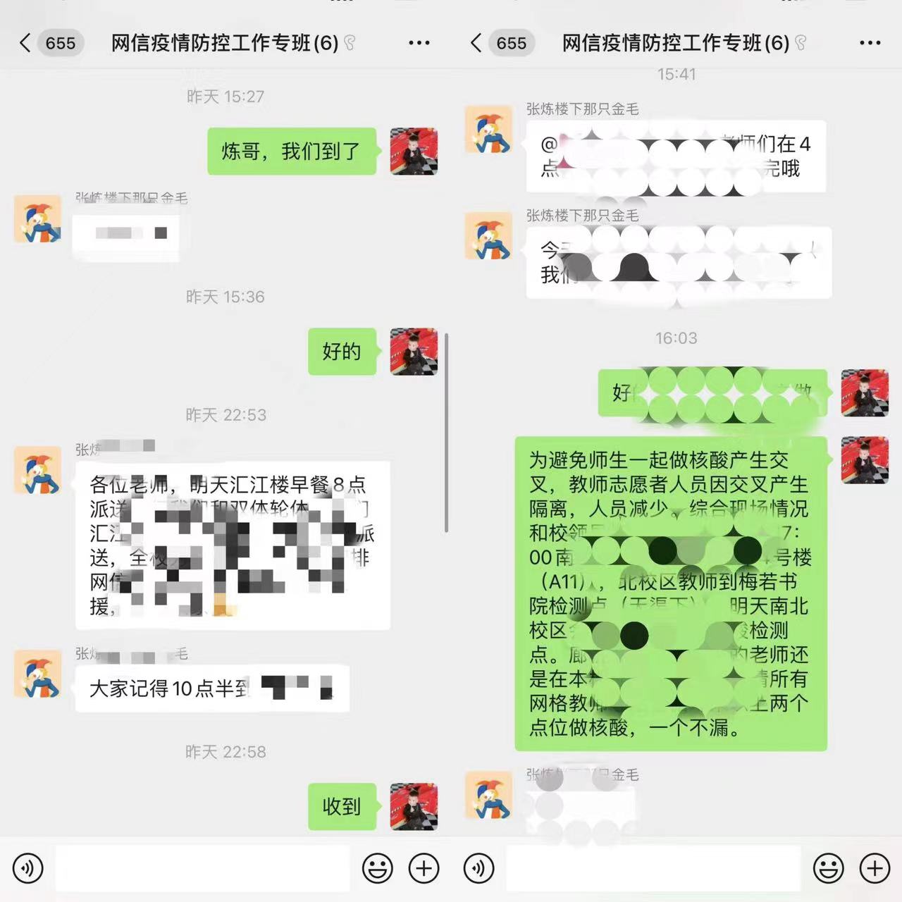 “疫中有情,疫中见义”,一句句温暖的话,体现了移通学院众志成城,与疫情战斗到底的决心。綦江校区网信中心老师心系合川同事,通过线上向战斗在一线同事表达了关心、鼓励之情。在所有志愿者老师的坚持下,学校的一切都有序进行着,情况也慢慢好了起来。同学们都在各种渠道感谢着老师们的付出,虽然不能出宿舍,但是大家互相理解、积极配合,无条件的信任老师们,这就是我们前进的动力。有一分热,发一分光,就像萤火一般,网信中心全体人员将继续发光发热,相信胜利的曙光就在前方!