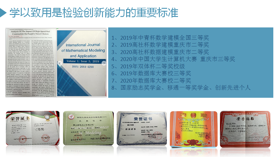 入学至今,先后参加数学建模比赛、程序设计大赛等学科相关比赛,荣获各类竞赛奖项若干;同时注重科创研究,在中青数学建模竞赛中研究“高铁对人们出行的影响”论文获得全国三等奖、高社杯“机场出租车决策”论文获得市级二等奖并发表于国际数模期刊IJJMJ上、“银行信贷决策”论文获得市二等奖等。