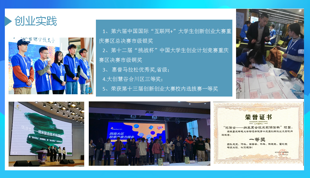 立足专业知识,全面发展的同时也不忘将自己创新、创业能力付诸于创新创业实践中;他和一群志同道合的大学生如命运安排般相识相拥,开始了他们团队的创业旅途。不同的院系不同年级,各自在自己的领域有所专攻,不同专业间的互补让他们团队有着财务管理、市场营销、硬件技术、软件技术等优势,也在创业路途中绽放着自己独特的光芒。他们参加过“互联网+”大学生创新创业大赛,渝创渝新创业创新大赛和许多外出学习。经过对创业课程的学习和校内外创业导师的指导,队伍从一个创业小白渐渐有了眉目,在实践中成长与蜕变着。这一年,他获得创新创业个人相关奖项10余次,第四届农村创新创业项目比赛国家级三等级;第十三届创新创业比赛一等奖,全国大学生电子商务三创挑战赛三等奖、中国“互联网+”大学生创新创业大赛重庆赛银奖、“挑战杯”全国大学生创业计划竞赛重庆赛区铜奖;“大创慧谷杯”大学生创业创新大赛创意组三等奖,惠普马拉松重庆市项目优秀奖并获得天使投资人青睐,同时获评学校创新能力提升先进个人、荣获创新创业奖学金。