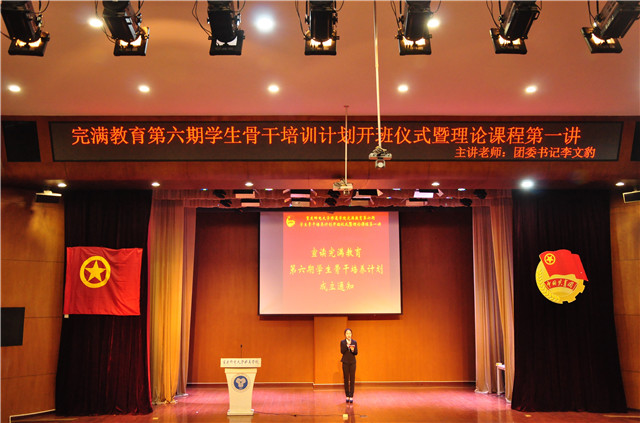 随着共青团团歌的奏响声,团委付梦竹老师宣读了完满教育第六期学生骨干培训班成立的通知。在完满教育不断的前行中,完满教育第六期学生骨干培养计划在秉承我校“人才培养”理念的基础上,结合当代大学生干部发展需求,进行创新与改革。本期培训计划采用周末集中制,理论学习结合实践锻炼相辅相成的形式。提升学员综合能力,关注学员学习效率。相信在各班班主任的带领下,学员们都能有所成长。