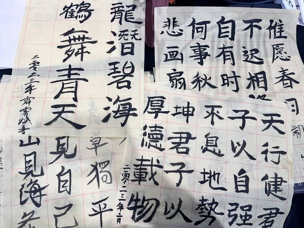 书法是人类的瑰宝,能起到平心静气的作用。在活动中,我积极和朋友互动、学习彼此写字风格、临摹仿照彼此字迹。我们互相探讨交流书写技巧,展示自我作品,玩的不亦乐乎。同时也明白了,人生需要学会沉淀,学会学习、学会总结才会收获更多的东西。