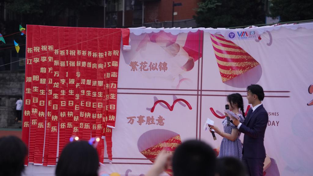 在《生日快乐》的祝福声中,主办方抬出了早已准备好的生日蛋糕,各位寿星们起身上台许下了生日的愿望。生日有蛋糕,有祝福,怎么能没有礼物呢?廊桥书院除了为每位寿星准备了特制的象征一帆风顺的帆船,还送上了一份特别的礼物——独一份的生日祝福横幅,生日的祝福横幅一条又一条地从屏幕上垂下时,现场响起了巨大的欢呼声。随后由黄羽萱、付思颖同学,带来歌曲演唱《少年》将现场的氛围再次推向了高潮。