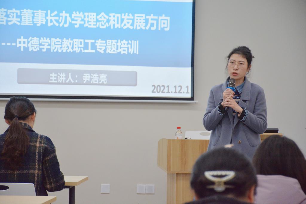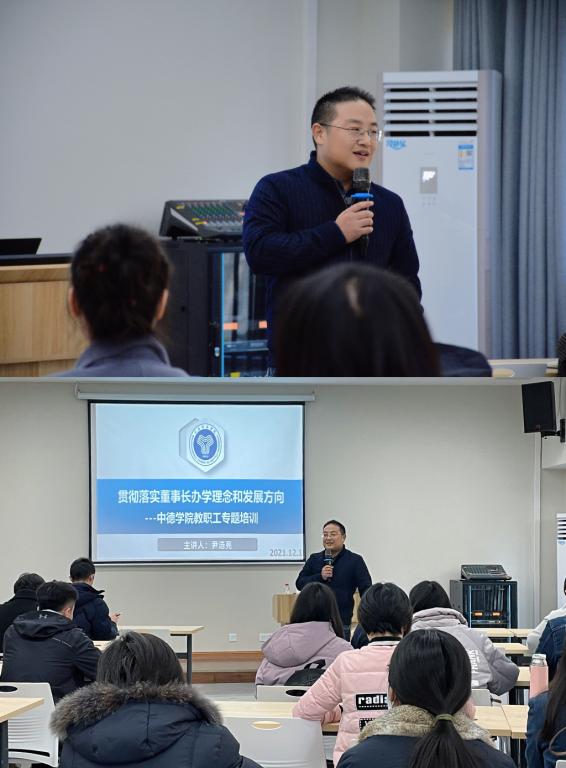 为贯彻学习集团的办学理念,12月1日下午,中德应用技术学院于南湖书院智慧教室开展了“贯彻落实董事长办学理念和发展方向——中德应用技术学院教职工专题培训”。本次培训邀请到校长助理、中德应用技术学院尹浩亮院长为学院全体教职工解读。培训开始,尹院长从“故事力思维”“跨越品牌鸿沟”“打破传统,缔造创奇”“聚焦突击,唯快不破” 四个维度带领学院教职工对董事长的办学理论进行深入学习。