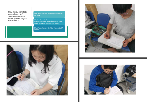 紧接着,唐老师又以中西方墓志铭为切入点,让学生思考中西方墓志铭中文字和内容的区别,并分成小组进行头脑风暴,并撰写自己的墓志铭,之后在全班分享自己想度过怎样的一生,死后想如何被后人记住。