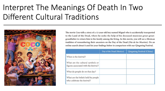 最后,唐老师引入电影《寻梦环游记》,给学生发放任务表格,让学生通过资料搜集及小组讨论,完成中国清明节与墨西哥亡灵节的文化比较、思考两国人民庆祝节日方式迥异所体现出的生死观念差异。