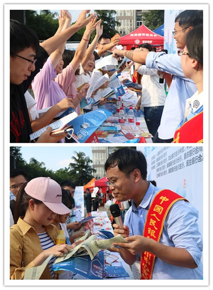 为提高当代大学生防范金融风险意识,唤醒学生对金融知识的关注,9月19日下午,我校在一二教广场开展了2018年“金融知识普及月,金融知识进万家”暨“提升金融素养,争做金融好网民”集中宣传活动。该活动由人民银行合川中心支行、合川银监分局、区教委、区金融办、区互联网信息办联合主办,工商银行合川支行、农业银行合川中支、中国银行合川支行等13家银行来到我校对我校学生进行金融知识宣传。
