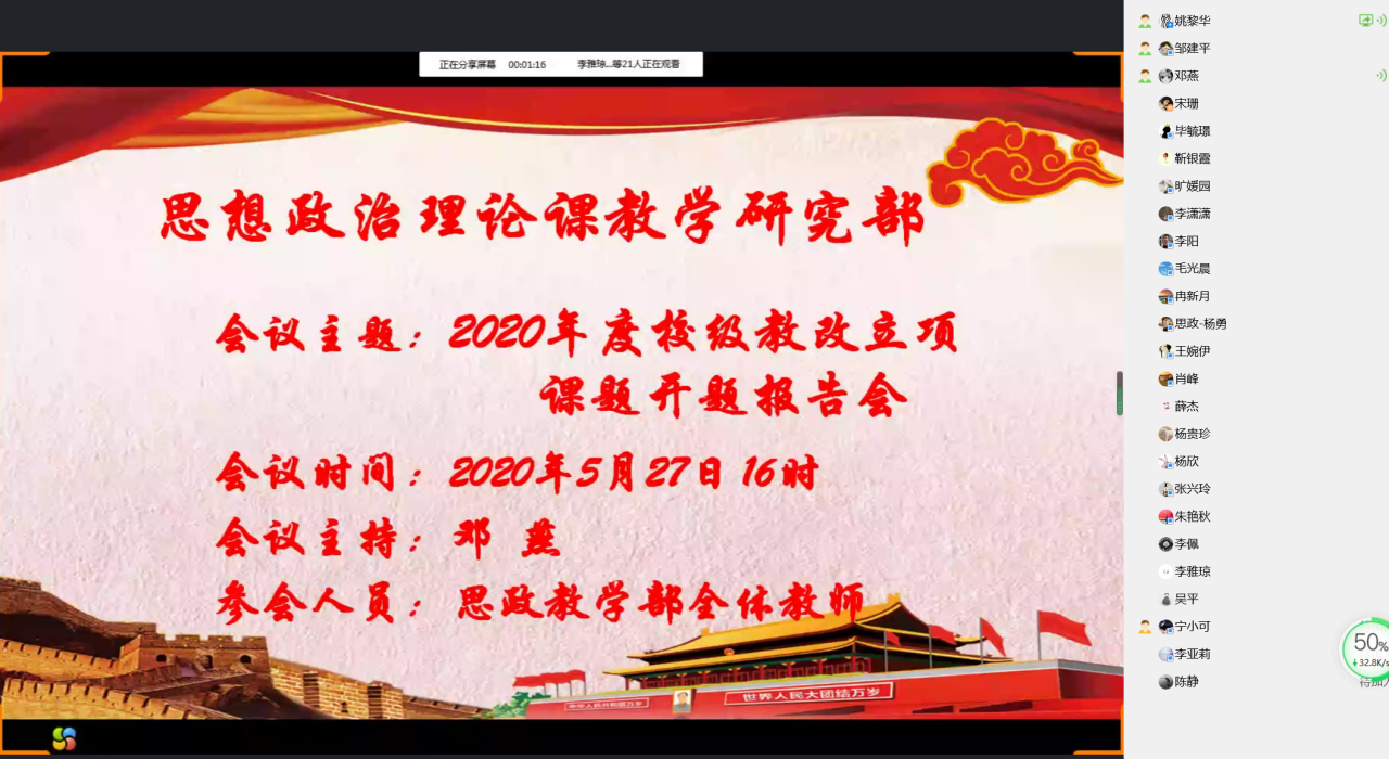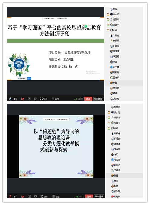 为进一步加强我部教育教学改革项目的过程管理,确保立项项目顺利实施。5月27日下午16时,思政教学部在“云端”召开了“2020年度校级教改立项课题开题报告会”,会议由教学部主任邓燕主持,会议邀请邹建平、杨勇、李阳等五位老师担任项目指导小组成员进行开题评议,思政教学部全体教师观摩。