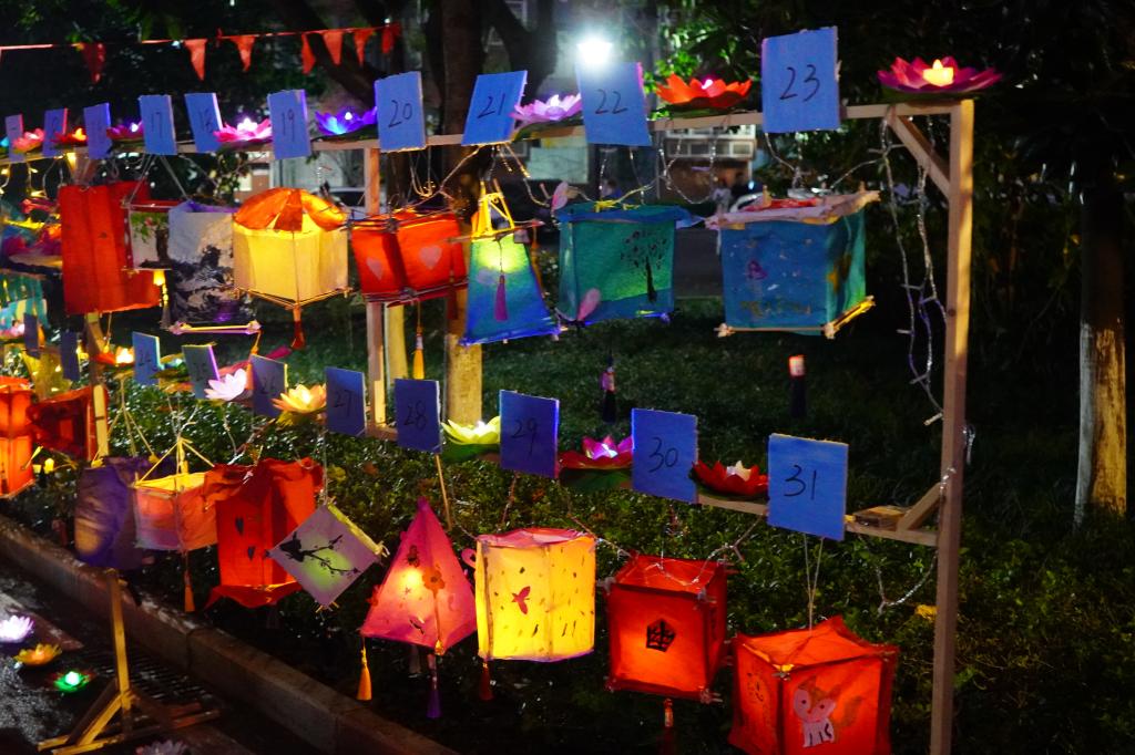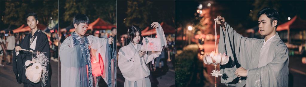 9月27日19:30,月色笼罩着湖畔大道,汇江书院将花灯展示投票现场设置在了游园会现场。时逢中秋又国庆,一盏盏精美的花灯悬挂在帐篷周围,吸引了不少同学驻足观赏,大家仔细阅读着花灯设计者们写下的创意理念,不时拍下张张照片,也为自己喜爱的花灯投票。华韵汉服协会的同学们身着传统服装,手执花灯行走展示,上演了一场“花灯秀”,收获阵阵惊叹。