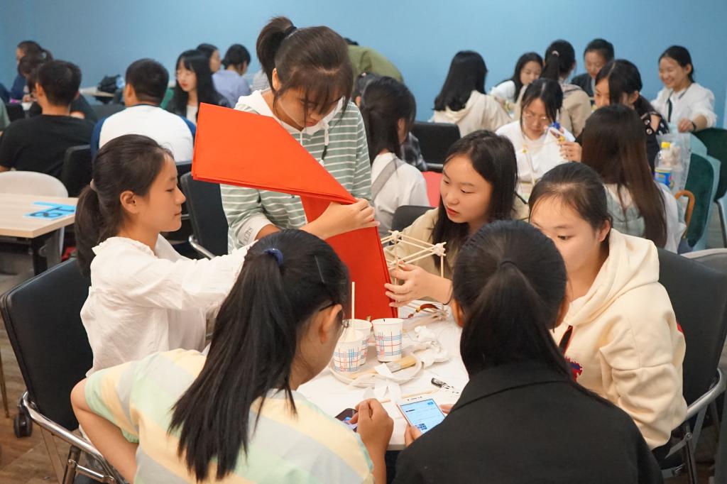 9月24日19:00,汇江书院功能室人头攒动,现场被布置出三十多个小组分区,工作人员组成了蓝色人流,他们分别指引道路、发放材料、维持秩序,参与者虽多,小小的场地却也井然有序。报名同学以四到六名为一组,需在80分钟内完成花灯制作。现场气氛热闹而又紧张,同学们不时低头思考、查阅资料,DIY手工协会的同学们更是在现场奔忙,不遗余力地为大家提供指导。一张宣纸、几根筷子、些许颜料与奇思妙想,同样的材料被创造出不同的风景。