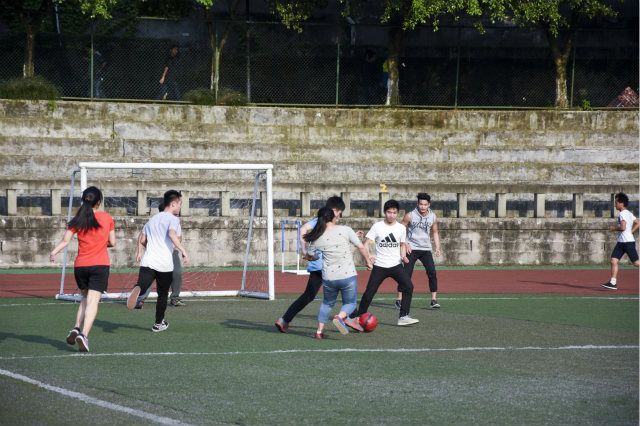 计算机系作为理工类院系女生如凤毛菱角尤其是网工专业,仅有的两个女生都自告奋勇的冲上足球场,从那些强壮的男生脚下抢球,真可谓是巾帼不让须眉,更成了球场上得分的关键助力。女生以自己独特的优势不战而屈人之兵,让这些男生们进退两难,只能眼睁睁看着要射门的球被女生一脚踢出场外,让人哭笑不得。