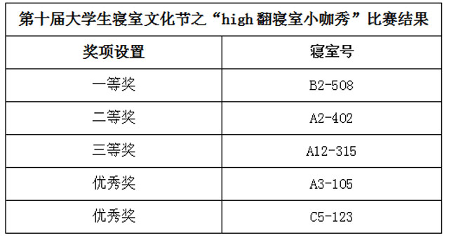 为培养同学们的集体意识,营造一个温馨、和谐的寝室环境,10月28日,由学生宿舍管理委员会承办的第十届大学生寝室文化节之“high翻寝室小咖秀”在3103教室成功举办。担任此次活动的评委有宿管中心白金龙、徐鑫、李仃仃、华雯老师以及来自八大校级学生组织的主席团代表。