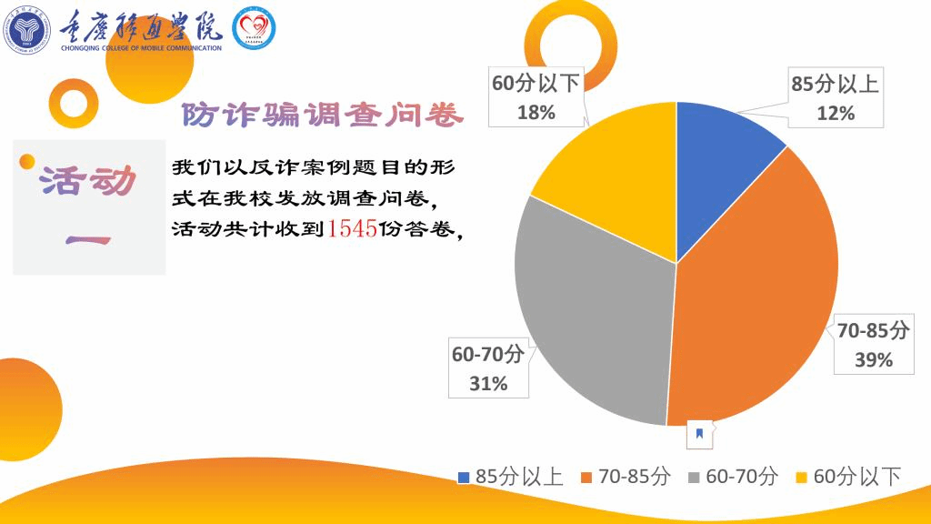 3月27日,子活动一正式拉开序幕,通过以刷单、网络购物、就业培训等网络诈骗案例为引导,面对全校师生发放了反诈防骗网络调查问卷。在全校师生的共同参与下,活动共计收集调查问卷1545份。其中85分以上占比12%,70-85分占比39%,60-70分占比31%,60分以下占比达18%。由此可见,当代大学生的反诈防骗意识仍然薄弱,也印证了我们开展此次活动的重要意义。