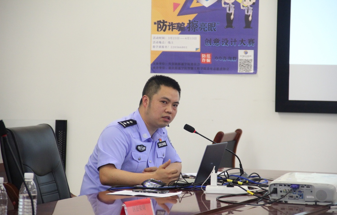 在此次反诈防骗宣讲活动中,智工青协邀请合川区公安局团委副书记范汗潇、合川区公安局反诈中心副大队长吴爽铭、智能工程学院青年志愿者协会指导老师郭超然为同学们进行反诈知识宣讲。