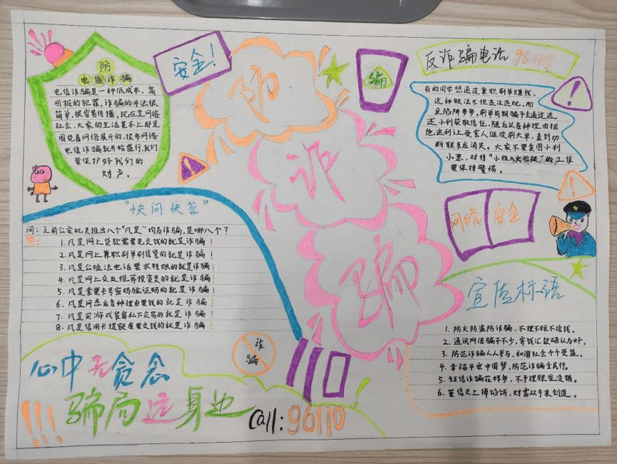 与此同时,本次活动的子活动二“防诈骗,擦亮眼”创新设计大赛也在有条不紊的进行。活动要求4-6人自由组队参赛,参赛队伍可以自主从视频类、标语类、图画类三类形式中选择并展开反诈防骗创意设计。在为期20天的时间内,全校共计186个队伍,共计750人参与,创作出视频、手抄报、海报、横幅等多种形式参与作品,让大家再迸发创意的同时学习掌握了反正防骗知识与技能。