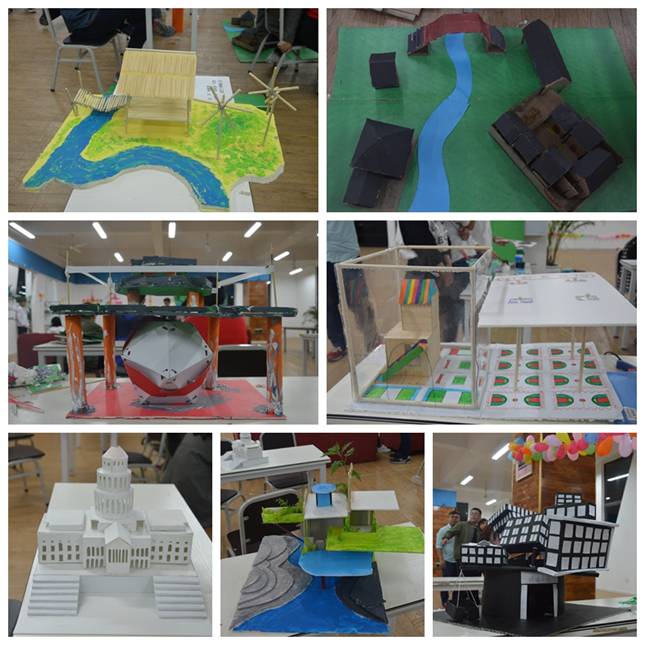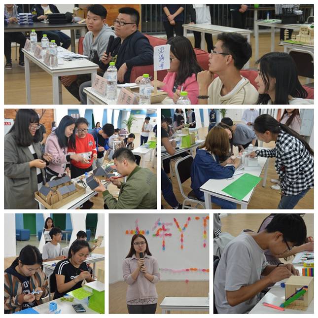 经过精心准备,九个参赛团队将凝结着他们创意与汗水的作品展现出来,他们的作品风格各异,制作精巧,别具匠心。其中,2号作品尤为堂皇,整体构造是依据外国的剧院形状进行设计的,白色的外表完美地展现了哥特式建筑的高贵。值得一提的是,有一组设计了以黑色为主色调和学士帽为雏形的悬空建筑,每一个房子的部分都经过了仔细的剪切与拼接,制作十分精巧。7号作品,灵感来自我校正在改进的篮球场,一个封闭的室内多功能遮风球场,采用太阳能环保电力系统,创意理念超前,获得好评。其他的团队也陆续介绍了自己的作品,有北京复古四合院;有湖边碧波图书馆;有风车田园小木屋,每一个作品都是智慧的结晶,各具特色。
