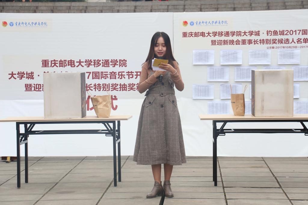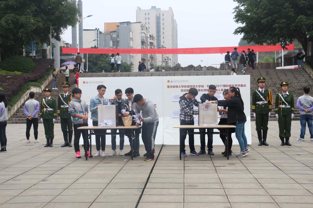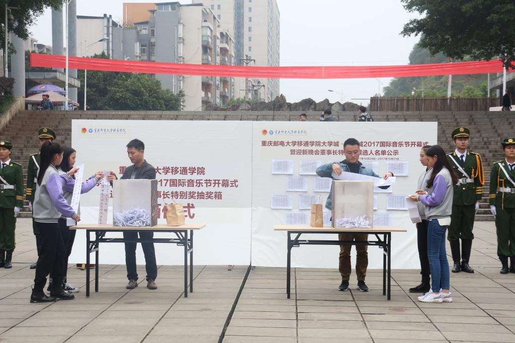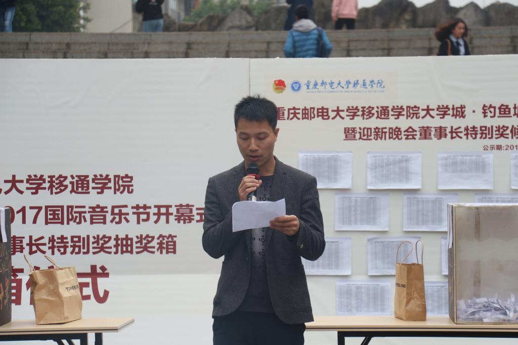 奏响潘多拉魔法盒,助力移通音乐节。2017年11月1日中午12:30,我院大学城·钓鱼城2017国际音乐节开幕式暨迎新晚会“董事长特别奖”抽奖箱封箱仪式如期在教学楼广场举行。