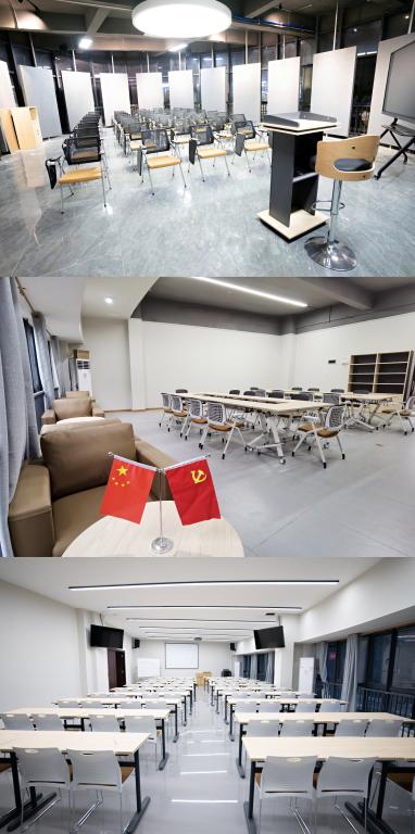 南湖书院新增书院建筑面积为1370平方米,含健身房、声影活动室、排练厅、智慧教室、圆桌会议室等功能室14个,配置移动式一体机、投影机及幕布、蓝牙音箱、调音台、点歌机等多个设备,可开展讲座、交流会、辩论赛、影音放映、舞蹈排练、主题研讨等多种类型的活动,竭力为同学们提供全面而舒适的使用体验。