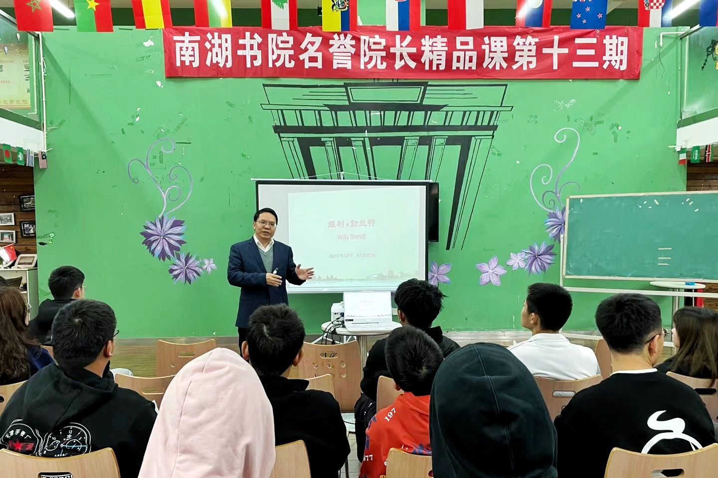 围绕面向国际、博采众长、走向世界的发展方向,南湖书院聘请四川外国语大学德语学院院长、四川外国语大学德国研究中心主任、教育部高校外语专业教学指导委员会德语分委员会委员、重庆市高校外语学科高级专业技术资格评审委员会委员李大雪教授担任名誉院长。李大雪教授,长期从事德语教学及中德法律方面的研究,承担过多项国家及省部级科研课题,发表多篇论文和专著,已开展德国历史人物维利·勃兰特、康拉德·阿登纳等名誉院长精品课十三期。