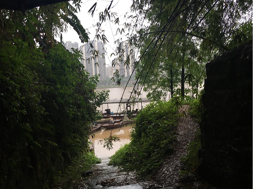 从城门抬眼一看,是一条因为行人稀少而布满了青苔的石板路,站在上面,依稀可以想象当时的繁华。对面的高楼大厦与东渡口隔江相望,让我们看到了现代化发展的速度,也预示着未来老街的发展趋势。