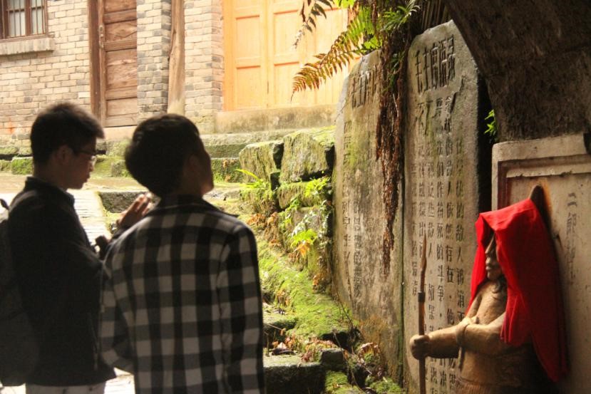 向下走去,只看到一座城门矗立在那,就像一个忠诚的守护者在守护着这片土地,城门下有一尊二郎神像。据当地人讲,因为当时二郎庙拆迁,人们就把二郎神像搬到了这里,以保平安。二郎神像旁立着两块碑,上面书写着毛主席语录,诉说着老街所经历的历史岁月。