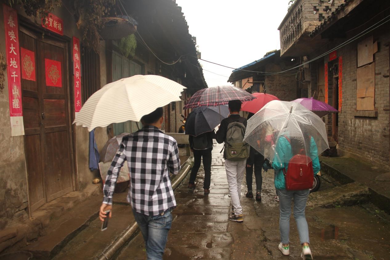 5月6日,天空下起绵绵细雨,同学们在非物质文化遗产研究中心彭伟老师的带领下,一行人来到了位于嘉陵江东岸钓鱼城之下的东渡口老街,开展老街文化调研。老街见证了百年沧桑,诉说着曾经的历史故事,回望繁华,已然颓败,曾经的记忆留存于人们的记忆深处。
