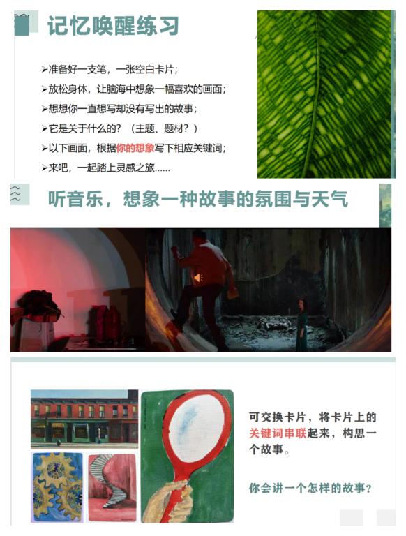 最后,在“自由交流”环节,吴老师与同学们分享了一些她平时获取灵感、收集写作素材的经验和方法。她甚至在现场做了一次简单的“写作训练”:播放一段音乐,随着屏幕上出现的不同画面,让每个人在卡片上写下不同的关键词:一个钟表的时间;选择一个你头脑中出现的地点;选择一个主人公,为他取一个名字;选择一个物品作为故事道具;听音乐,想象一种故事的氛围与天气,写下关键词。然后,将卡片上的所有关键词串联起来,试着构思一个故事,这个故事要与自己内心想要诉说的一些东西相结合。