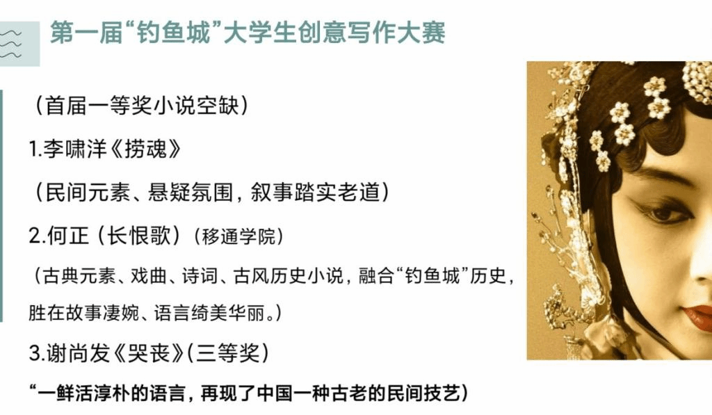 参与本次活动的学生有20人,都是对创作有着极大热情的文学爱好者,包括已在各个刊物上发表作品、有着一定创作经验的罗宇舟、孟明明、徐洋、李睿涵等人。做完简单的自我介绍之后,吴老师便开始了对前两届“钓鱼城”创意写作大赛获奖作品的分析。首先介绍和分析的是虚构类作品:第一届获奖作品中,从充满悬疑氛围、民间元素、语言娴熟的《捞魂》,到古典元素浓厚、语言绮美华丽、以“钓鱼城”历史为背景的小说《长恨歌》,再到“鲜活淳朴的语言,再现了中国一种古老的民间技艺”的《哭丧》,以及奇幻古风向的《禁域》等等作品。随后吴霞霞老师又着重分析了第二届的两部摘得大奖的作品:富含魔幻现实主义、东西方文化结合、藏区地域元素浓厚的《莫家街角》,以及奇幻、先锋、隐喻、想象力丰富、思想寓意深刻的《飞行的特拉兽》。