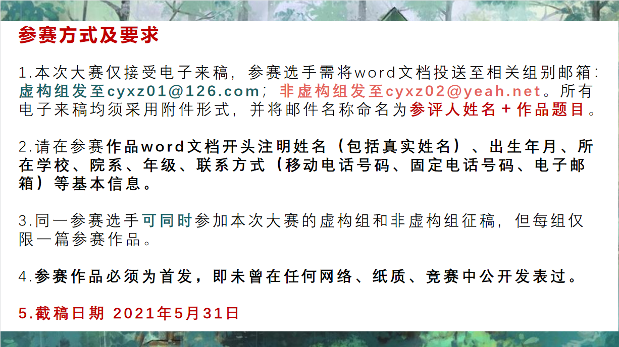 随后,吴老师便重点强调了投稿的注意事项:1、稿件格式;2、标题格式;3、作品排版;4、署名、联系方式;5、截稿时间;6、字数要符合要求;7、投稿邮箱是否正确。“在网络上公开发表自己的作品时要慎重,要注意保护自己的版权。大赛的参赛作品拒绝一稿多投。原创,永远是一个写作者对自己最低程度的要求,也是一个写作者的底线。”