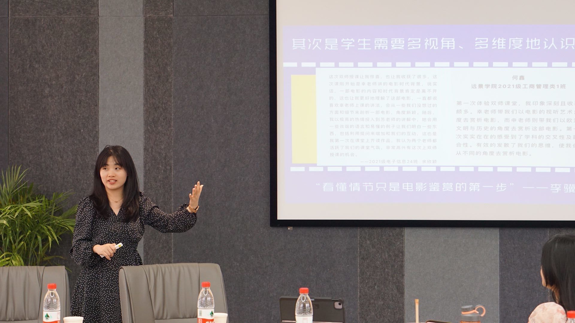 重庆移通学院綦江校区教师代表幸李寒老师从上双师课的原因、选题、有效性三个角度综述了授课的目标及实施路径。她以电影《布达佩斯大饭店》的授课经验为例,阐述了双师模式既能弥补单个教师在非自身专业领域的短板,又能帮助学生多视角、多维度理解电影,且与电影学科自带的综合性质天然适配。借《了不起的盖茨比》《降临》为例,她表明所选影片是否涵盖跨学科元素,是否与合作教师们专长对应,是否易于学生接受,都是选题关键。最后,她强调与学生、与搭档老师的频繁沟通,时刻认清自己的职责也可以促进课程有效开展。