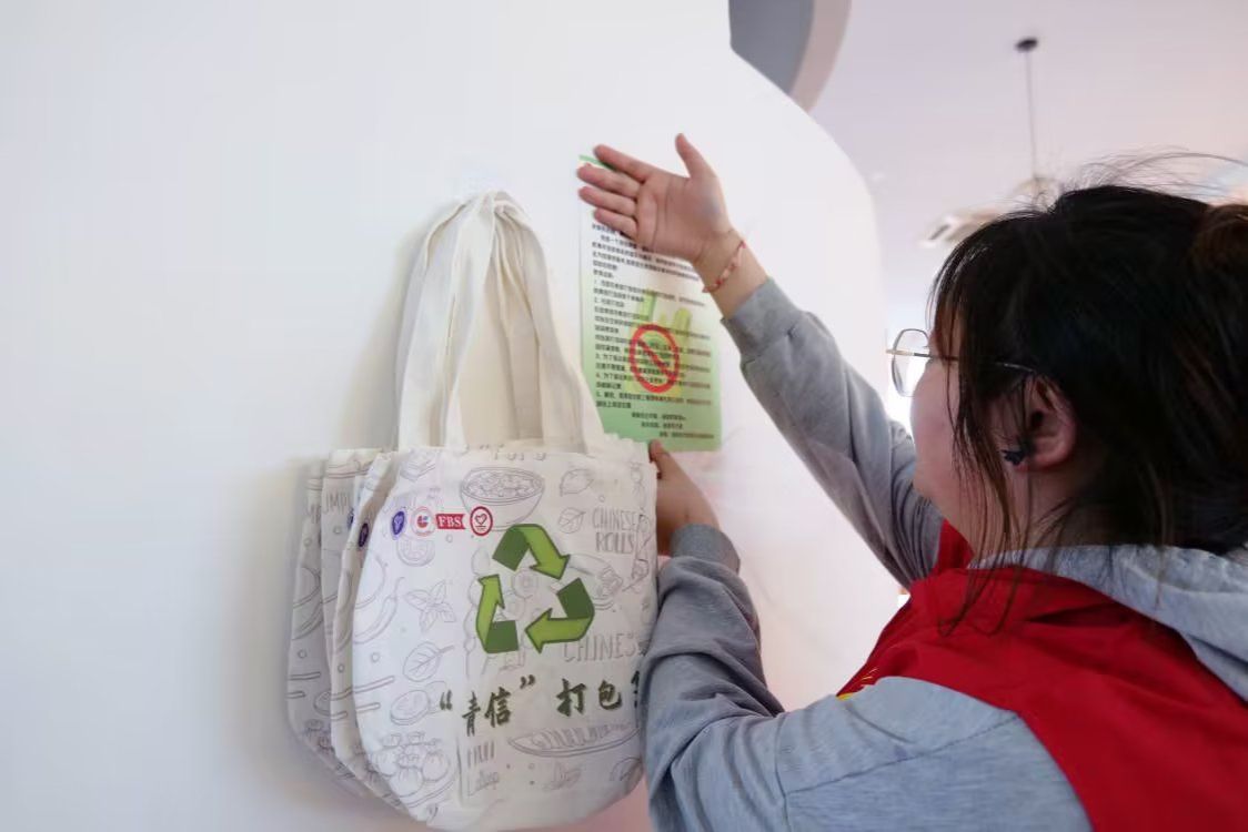 针对食堂打包塑料袋浪费严重问题,淬炼·国际商学院青年志愿者协会的志愿者们2023年4月18日将青信袋铺设到了各个食堂的档口用于学生打包使用,希望用帆布袋代替塑料袋,从而减少一次性塑料袋的浪费问题和对环境的污染问题。同时,青信袋属于公共财产,同学们打包后需到指定地点归还,共同搭建起诚实守信的桥梁,为环保的发展提供保障。