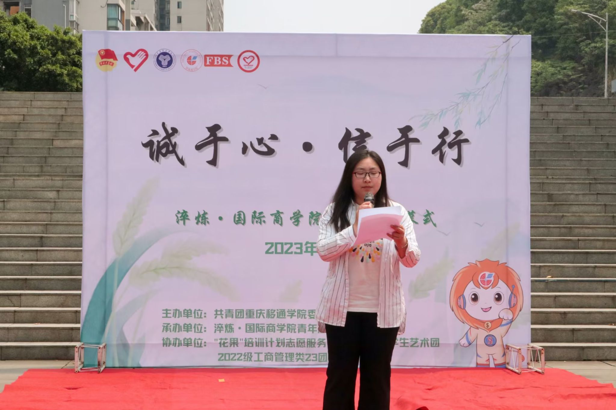 青信之约,邀你共续。为倡导广大移通学子积极参与到志愿服务活动中去,营造人人参与志愿的校园氛围,同时推进我校青年体系的建设,强化青年诚信意识,淬炼·国际商学院青年志愿者协会于2023年4月15至4月30日开展了以“一念心诚·植根信用”青信月活动。本次活动积极搭建桥梁,为移通学子营造一个诚实守信的校园氛围,将青年信用体系与移通学子结合起来,通过脱口秀、青信袋铺设等多种活动方式积极引导移通学子树立正确的价值观和行为规范,培养同学们诚实守信、遵纪守法的良好品德和社会责任感。现在,一起来回忆青信月活动的精彩瞬间吧!