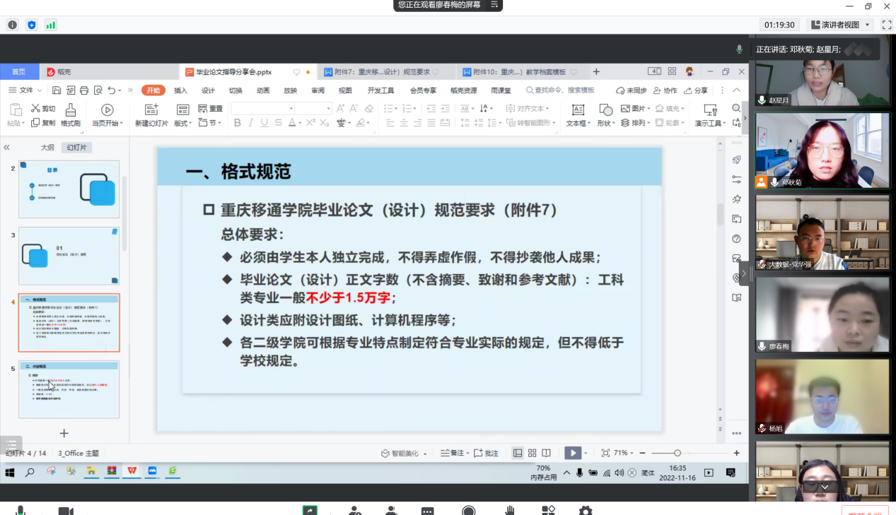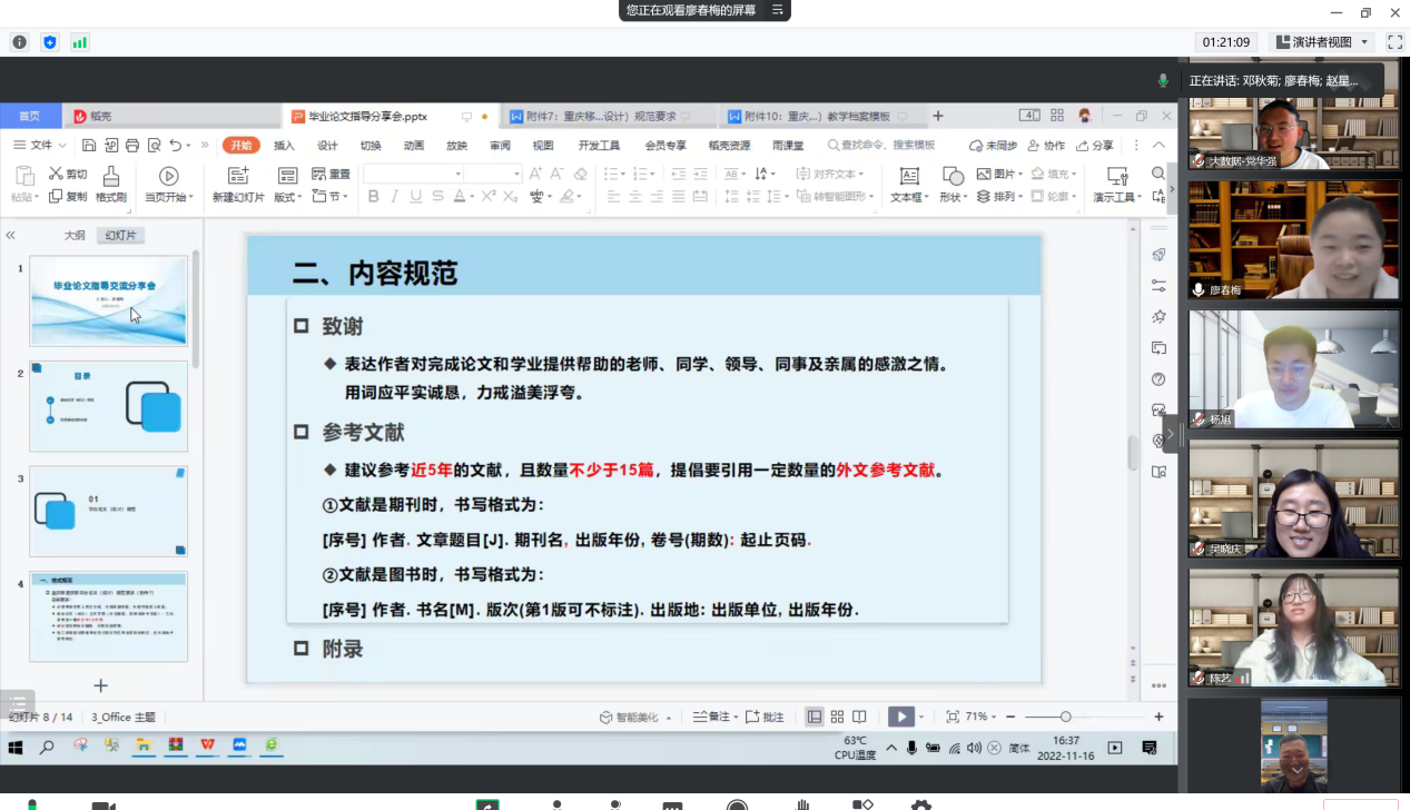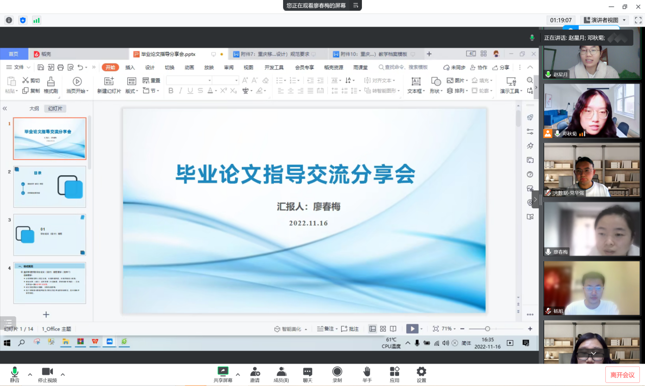 为了切实做好2023届本科生毕业工作,也为更好的帮助教师提高指导毕业论文的能力,提升大数据与计算机科学院软件工程专业毕业论文写作的水平及质量,软件教研室于11月16日下午4:00在腾讯会议召开了2023届毕业论文指导交流分享会。本次会议由教研室主任邓秋菊主持,软件教研室全体教师参加。