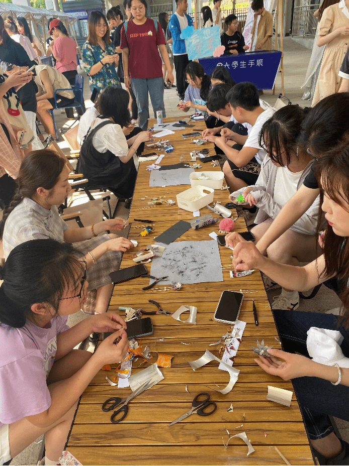 在老师们的引导下,所有在场的同学们通过手工制造簪花、苗族文化知识竞答、手工DIY手链、打卡拍照等环节切身经历,深刻感受苗族文化魅力。