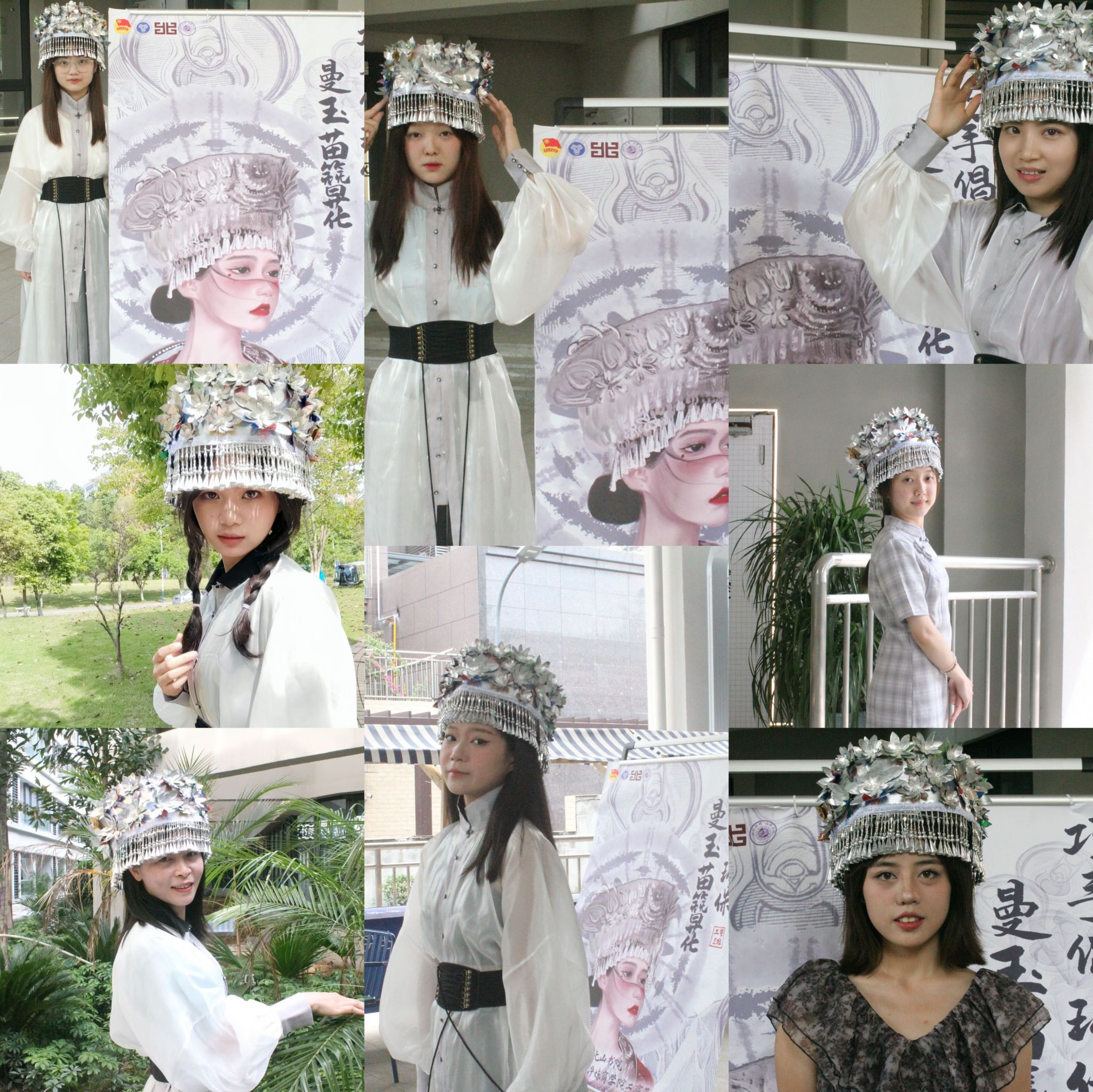 环节1:博闻强识·茹古涵今。在宣纸上展示出苗族文化风俗小标语,再通过一问一答的方式深刻了解苗族文化。环节2:神藤神剪·别出心裁。同学们通过在回收的易拉罐铁片上描绘成花,裁剪成一片片小花瓣,将绿色低碳与非遗文化相结合,展现了当代青年对非遗传承的追溯。环节3:匠心独具·乐道拾遗。以手造物,以物寄情,同学们将一片片剪裁好的小花瓣拼装成花朵,再把一朵朵花拼接成簪花。环节4:云想霓裳·蝉鬓飞云。同学们头戴苗族头饰,穿上汉服进行打卡拍照,素色汉服加精美苗族头饰互相映衬。
