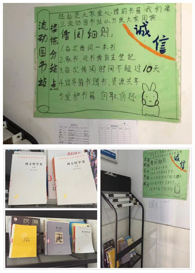 “流动图书站”书籍的种类众多,包括课本、辅导资料、课外图书、杂志、文学著作等,总站是分站的资源总库,楼栋分站所有书籍皆从总站“流出”,各有15本书按类别放置在报刊架上,宿管会工作人员会定期将分站的书籍与总站资源进行互换和定时每个楼栋分站墙上均贴有“诚信借阅日志”和“赠书登记表”:诚信借阅日志是同学自行登记借阅信息,并在约定时间内归还;赠书登记表则是同学捐赠书籍的情况登记。