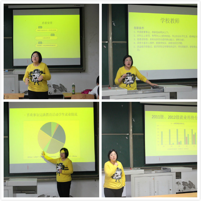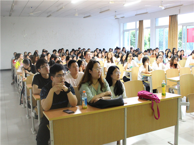 首先,外语系2016级辅导员纪治阳老师就当下就业的情况进行简要的分析。通过PPT 的形式,将2011、2012级学长学姐们的就业情况进行分析,从事教师职业占据相当的一个比例,不少学长学姐也选择跨专业从事金融等职业,对外贸易也成为了一个比较热门的选择。接着纪老师通过饼状图向大家展现“喜欢参加完满教育活动”的学生就业情况,无可反驳的是,完满教育通过课外活动的形式锻炼了学生的多项能力,交际、艺术爱好、体质等都是就业竞争中非常有利的条件。也因此,喜欢参加完满教育活动的同学能够在步入社会后通过自己锻炼出来的能力应聘到更符合自己心中所想的职业和职位。