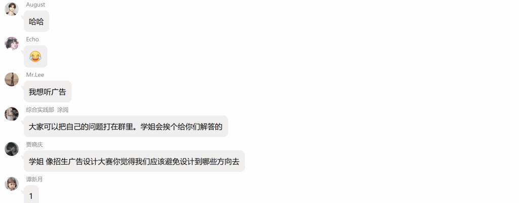 活动中学姐借正火热开展的“闪耀移通”招生设计大赛给同学们详细分析了伙伴、创意、策划和答辩的重要性。尤其是在创意方面,学姐提到,学习更多的技能可以让自己的创意变得更引人注目,例如网页设计、PS、视频创作等等。老话说得好“技多不压身”,技能多多,也会让创意设计的亮点多多。