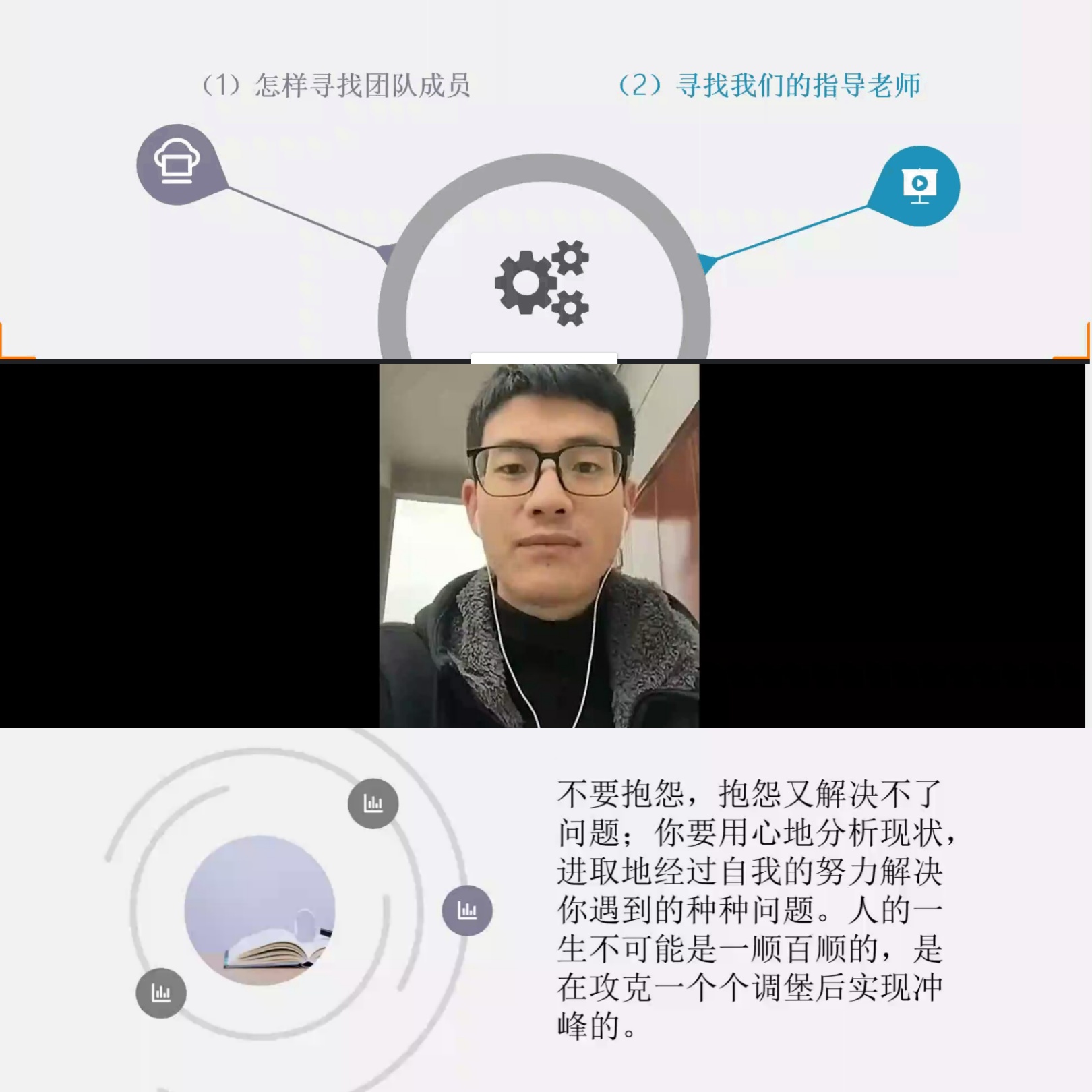 “说到竞赛离不开‘伙伴、创意、策划和答辩’这四个重要步骤,更离不开团队的协作和成员的态度。”吴萍学姐在活动开始时着重分享了她对竞赛的个人心得。谋事在天,成事在人,正确的态度在竞赛过程中确实起着重要影响。学姐用辅导员熊斌老师的鼓励视频和大家共勉,鼓励大家参加比赛时要用积极的态度去面对,困难总会遇到,但积极面对,必然会有收获。