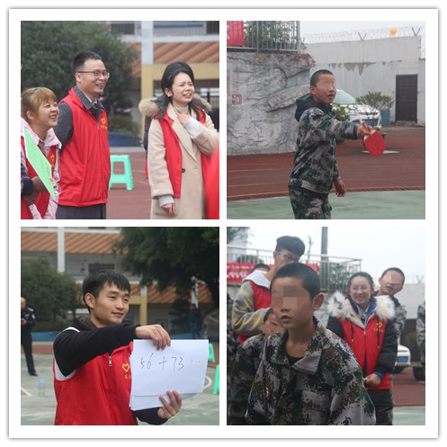 为了将关爱更好的传递给需要的人群,2019年12月8日下午3点,大数据与软件学院的志愿者们带着满满的热情来到了合川工读校。除此之外,此次同行的还有合川平安志愿者联合会会长何会长、大数据与软件学院副院长王焱老师、团总支书记马喆老师、学工办主任任瑞娟老师、2016级辅导员杨露月老师以及志愿服务板块指导老师兰宇老师。他们携手志愿者共同在工读校开展了“暖阳青春 运动向阳”的主题活动,旨在为工读校的孩子们带来一份特别的冬日温暖。