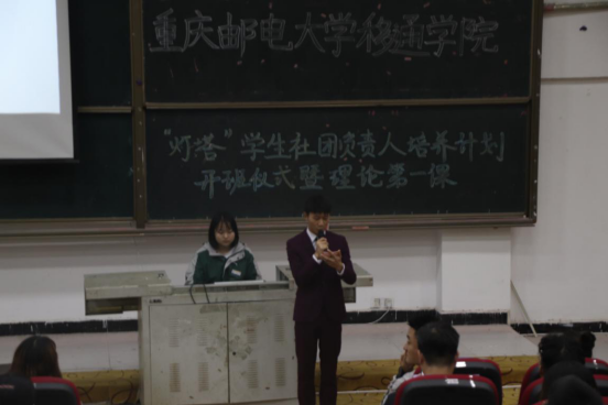 为不断完善我校社团运行机制,进一步推进学生社团发展,践行学校育人理念,培养学生社团负责人综合能力,为其提供实践与学习的平台和机会。我校于2019年首次提出学生社团负责人培养计划,在10月9日下午16:00,重庆邮电大学移通学院“灯塔”学生社团负责人培养计划开班仪式暨第一讲在第三教学楼3303教室正式拉开帷幕。