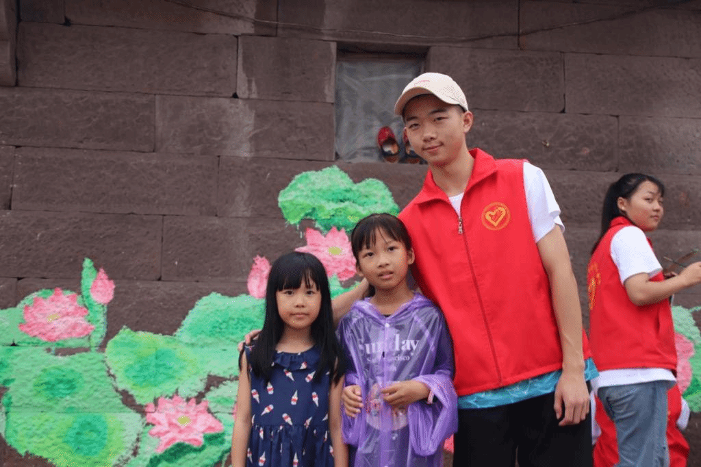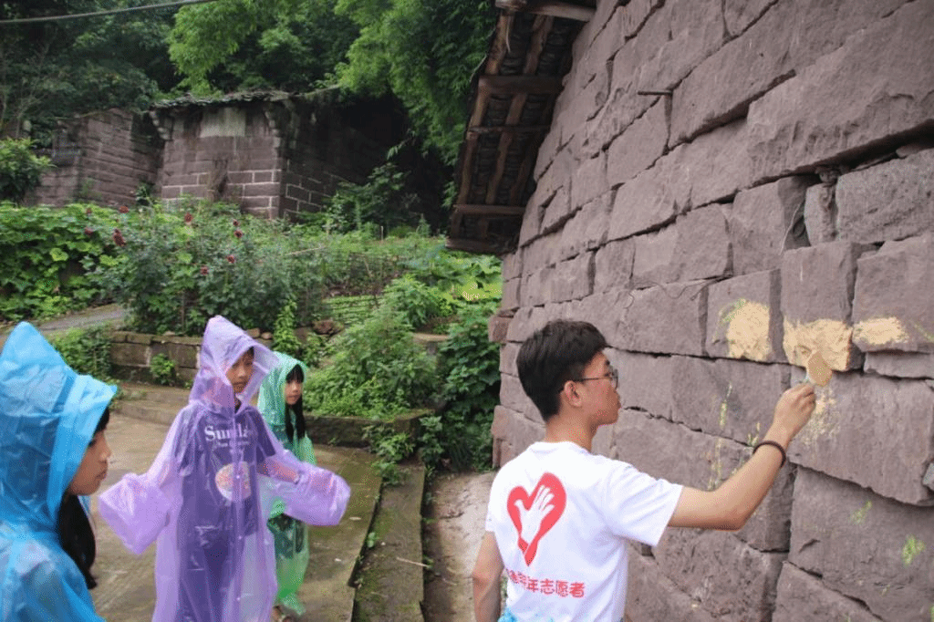 志愿者结合当地旅游特色,运用专业知识,以彩绘的方式去呈现当地风貌。从刷墙到清扫,从图稿到上墙,每一位志愿者都认真仔细。尽管屋檐外小雨淅淅,打湿了志愿者的衣衫,但他们并没有放下手中的画笔。笔起笔落,志愿者和孩子们共同铸就了石墙彩绘,在他们的一笔一画中墙面变得更加光彩夺目。他们用自己的绵薄之力为村民们送去温暖,为戴花村的文化宣传建设而助力。