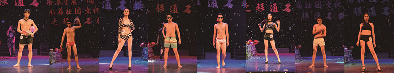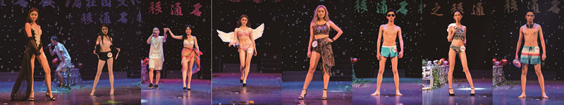 炎炎夏日,泳衣装莫过于最清凉的打扮。浪漫的音乐中,模特们也缓缓走出。此刻,模特们仿佛置身沙滩,毫无约束,大方的表演。男生穿着短裤,露出完美的胸肌;女生穿着性感的泳衣,凸显出完美的身材,模特们用动感的台步点燃了在场的观众,积极应援。走秀时,因为选手展示,台上出现了一些水,导致模特走秀时滑到,但他们并没抱怨,而是站起身,将表演继续,敬业的精神为他们点赞。