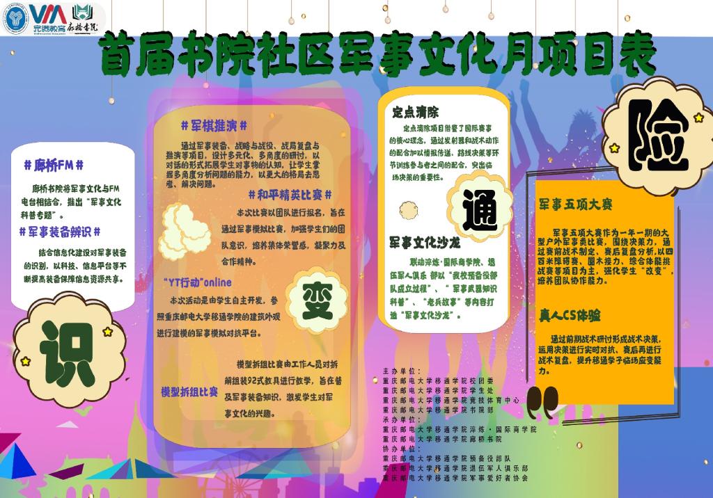 为拓展学生对军事文化的兴趣,提高学生对国防建设的认可,助移通学子更好理解完满教育,更快融入大学生活,廊桥书院结合“决策力”培养基点“洞察、对话、格局”开展由重庆邮电大学移通学院学生处、校团委、竞技体育中心、书院部主办,廊桥书院、淬炼·国际商学院、竞技体育中心拓展训练部承办,预备役部队、退伍军人俱乐部、军事爱好者协会协办,以“‘识·变·通·险’立军魂,热血燃烧抒国梦”为主题的首届书院社区军事文化月。